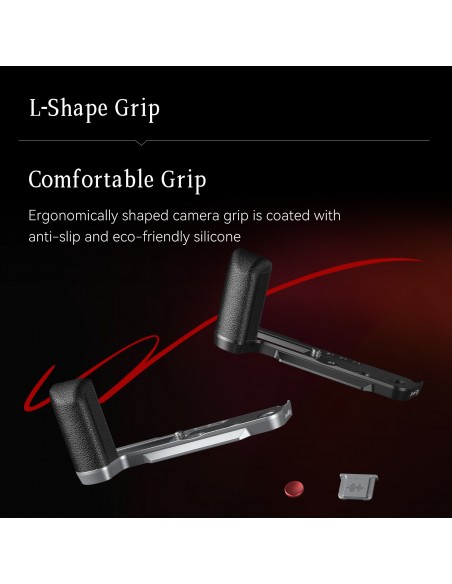 L'impugnatura a forma di L SmallRig per FUJIFILM X100VI / X100V è progettata per migliorare la presa della fotocamera. L'impugnatura a forma di L si monta sulla fotocamera con una vite da 1/4"-20 nella parte inferiore e i cuscinetti in silicone integrati prevengono i graffi. La struttura e il colore dell'impugnatura si abbinano perfettamente con FUJIFILM X100VI / X100V. L'impugnatura integrata nella piastra base a sgancio rapido Arca-Swiss consente un montaggio e smontaggio facile e veloce del treppiede tipo Arca. Quattro fori filettati da 1/4"-20 nella parte inferiore per fissare piastre e treppiedi tipo Manfrotto. Slot per cinturino per cinturino da polso (ID: 3848 ) . La chiave piatta incorporata sul fondo per un facile montaggio e smontaggio degli accessori. L'impugnatura viene fornita con l'esclusiva copertura hot-shoe con impressa l'onda sonora "FUJIFILM" e l'anno di fondazione come nostro tributo a FUJIFILM. Inoltre è dotato di un pulsante di scatto per garantire un tocco morbido e confortevole delle dita.