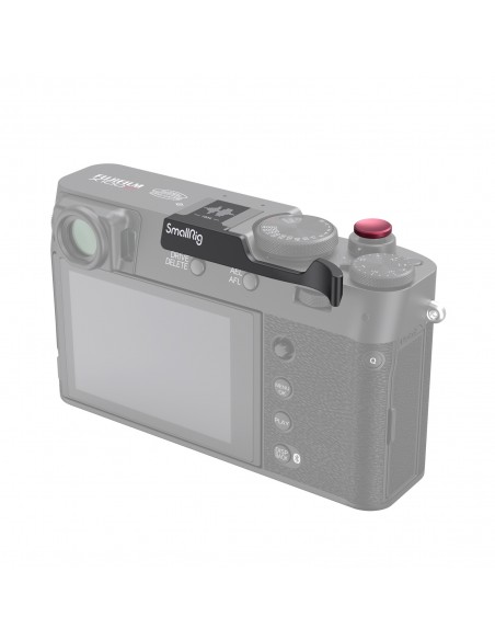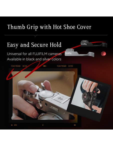 L'impugnatura per pollice SmallRig per FUJIFILM X100VI / X100V è progettata per migliorare la presa e migliorare la sicurezza quando si tiene la fotocamera con una mano. L'impugnatura per il pollice si installa facilmente facendola scorrere nella slitta della fotocamera. Il design concavo dell'impugnatura migliora la sicurezza e aumenta la comodità durante le riprese con una sola mano, facilitando la creazione di contenuti. L'impugnatura del pollice è incisa con l'onda sonora "FUJIFILM" e l'anno di fondazione come nostro tributo a FUJIFILM. I cuscinetti in silicone integrati proteggono il corpo della fotocamera e i componenti elettronici della slitta a contatto caldo da polvere, ruggine e cortocircuiti elettronici. Inoltre è dotato di un pulsante di scatto per garantire un tocco morbido e confortevole delle dita.
