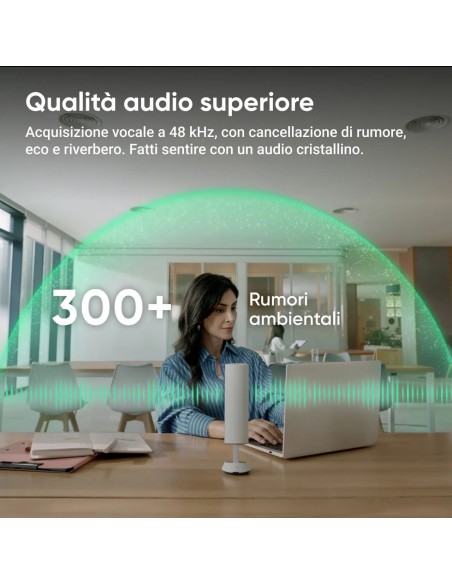 - Ampio raggio d'azione e registrazione professionale: l'array 3D composto da 8 microfoni cattura le voci fino a 5 metri di distanza, come se chi parla fosse proprio lì accanto. La frequenza di campionamento professionale di 48 kHz assicura che ogni dettaglio delle tue riunioni remote venga catturato in qualità hi-fi.