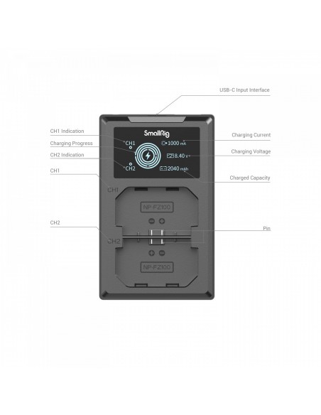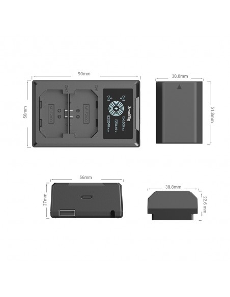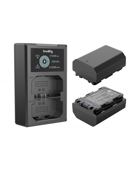 Il kit batteria e caricabatterie per fotocamera SmallRig NP-FZ100 3824B include due batterie e un caricabatterie. La batteria, dotata di un chip di decodifica completo, supporta perfettamente diverse fotocamere senza causare finestre pop-up e ha un guscio in ABS e PC satinato ignifugo di qualità per garantire tocco raffinato e durata. Ha le stesse dimensioni della batteria originale e si inserisce perfettamente nel vano batteria. Il caricabatterie doppio può caricare due batterie contemporaneamente, grazie allo schermo LCD che visualizza la tensione di carica, la corrente e la capacità di carica in tempo reale. Viene fornito con un cavo di ricarica USB-A integrato e un'interfaccia di ingresso USB-C, che consente di caricarlo tramite un adattatore USB, un caricatore per auto o un power bank.