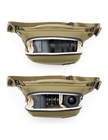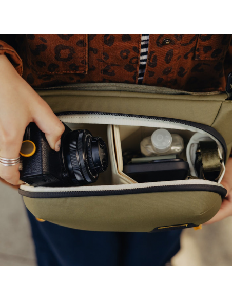 La borsa minimalista ideale per 1 fotocamera. Ottimo per un solo corpo + obiettivo e alcuni accessori. Ideale anche per il trasporto quotidiano o di viaggio essenziale. Una fionda che è anche indossabile come una borsa alla moda.