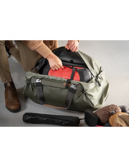 Entrambe le dimensioni funzionano perfettamente con i cubi da imballaggio Peak Design, i cubi per fotocamera e le buste, venduti separatamente. Il 35L contiene 3 unità di Packing/Camera Cubes, il 65L contiene 4 unità, con tonnellate di spazio bonus per ulteriore spazio di archiviazione.