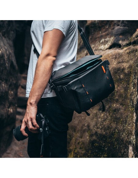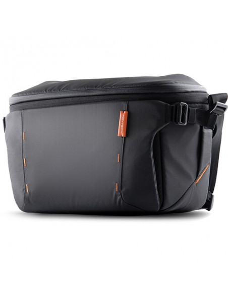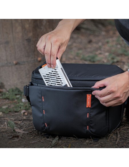 L'imbracatura nera 11L OneMo di PGYTECH ha una struttura innovativa e una grande apertura superiore che rende facile l'imballaggio e l'organizzazione dell'attrezzatura. La custodia principale contiene fotocamere, droni o iPad. La manica centrale ha uno stile aperto ideale per stabilizzatori o oggetti più grandi e la manica anteriore può contenere piccoli accessori e una bottiglia d'acqua da 16 once. Ha una tasca per la batteria e l'indicatore di alimentazione. Questa borsa ha tre strati all'interno. Puoi espandere l'interno della tua borsa verticalmente decomando lo strato centrale e tirando la manica verso l'alto. Una cinghia esterna sul fondo dell'imbracatura tiene un treppiede e si possono attaccare clip per fotocamere o moschettoni alla cinghia sulla cinghia. Porta comodamente la tua fionda con la tracolla spessa, larga e traspirante con pad. Una tasca nascosta contiene il tuo AirTag per la protezione antifurto.