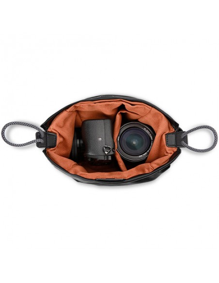 Questa borsa può ospitare una fotocamera mirrorless di medie dimensioni con una lunghezza combinata del corpo e dell'obiettivo inferiore a 6,3". In alternativa, può contenere una action cam come GoPro, Insta360 o DJI Action.