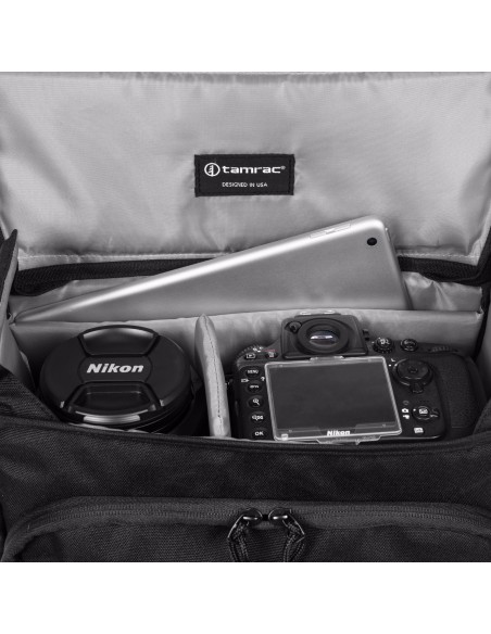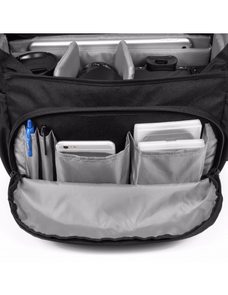 Con il suo profilo sottile, il look fresco e il design moderno in stile messenger, non sembra una borsa fotografica.