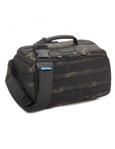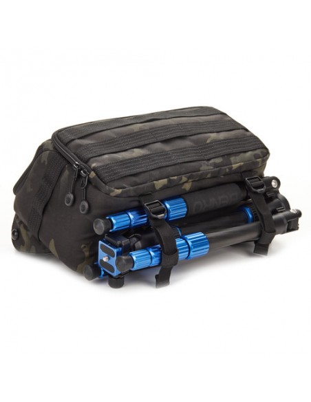 La borsa a tracolla MultiCam nera AXIS V2 di Tenba ha una capacità di 6L per proteggere e trasportare una fotocamera più quattro obiettivi fino a 70-200mm f/2.8 o un kit di droni DJI Mavic. La fettuccia MOLLE espandibile all'esterno è compatibile con i sacchetti per batterie Tenba Tools e i portafogli per schede di memoria. Questa fettuccia può anche ospitare varie buste e accessori standard militari. La tracolla ha una schiuma di memoria morbida e body-contouring per tenerti a tuo agio anche quando porti carichi pesanti per lunghi periodi. Il fondo della borsa ha cinghie per trasportare un treppiede o un monopiede. Una tasca nascosta contiene un Apple AirTag o Tile Bluetooth Tracker fornito dall'utente in modo da poter localizzare la tua fionda se si perde.