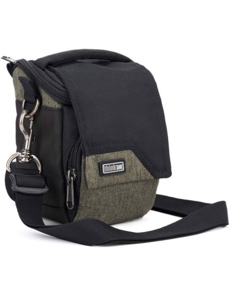 La borsa può essere trasportata tramite il manico superiore, indossata sopra la spalla con una tracolla regolabile o indossata sulla cintura dei pantaloni utilizzando la fessura passante posteriore. Le tasche laterali elastiche e una tasca interna in rete possono contenere accessori come schede di memoria, batterie o la copertura antipioggia con cuciture termosaldate inclusa.
