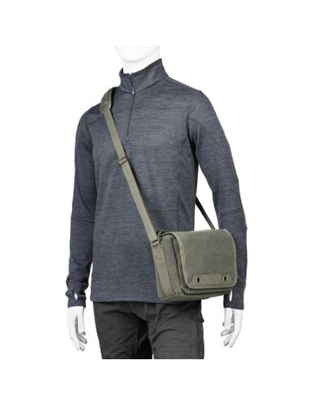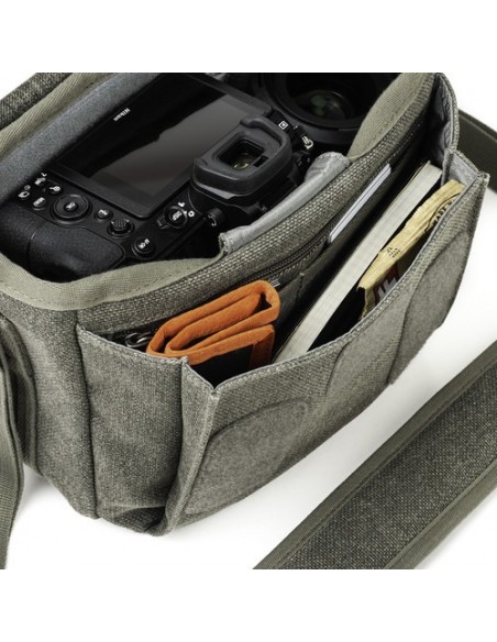 - Borsa fotografica compatta in stile messenger che può contenere una DSLR di piccole o medie dimensioni, una fotocamera mirrorless o una fotocamera con telemetro con due o tre obiettivi