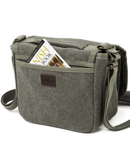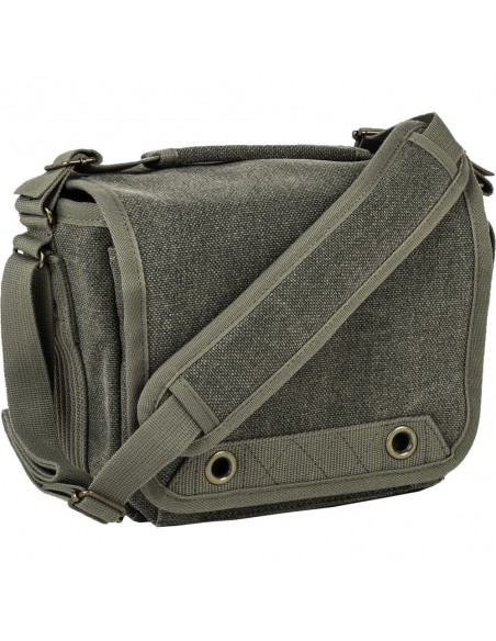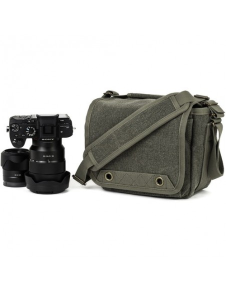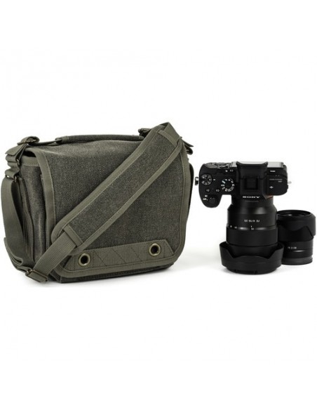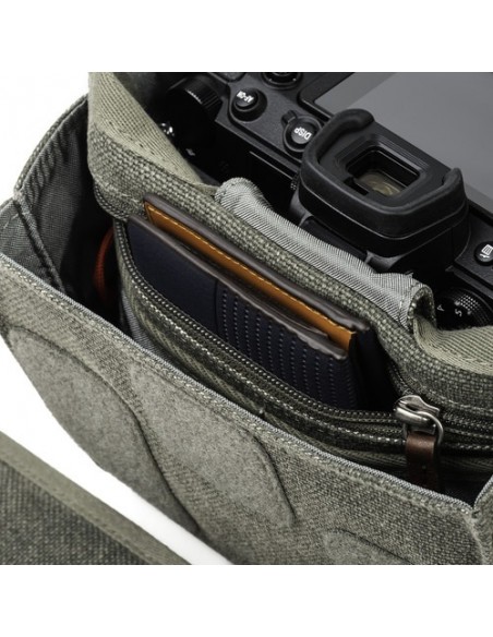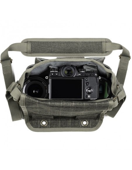 Questa borsa a tracolla Retrospective 4 V2.0 color pietra di pino di Think Tank è una borsa compatta in stile messenger per fotocamera che può contenere una DSLR di piccole o medie dimensioni, una fotocamera mirrorless o una fotocamera con telemetro con un massimo di due o tre obiettivi. All'interno dello scomparto principale della borsa a tracolla Retrospective 4 V2.0, quattro divisori imbottiti e regolabili possono essere configurati in base all'attrezzatura fotografica specifica trasportata. Per migliorare le capacità organizzative di questa borsa a tracolla, uno dei divisori presenta tasche progettate per contenere uno smartphone e schede di memoria.