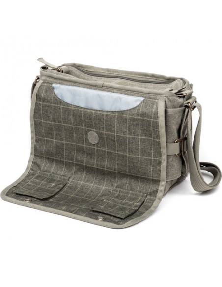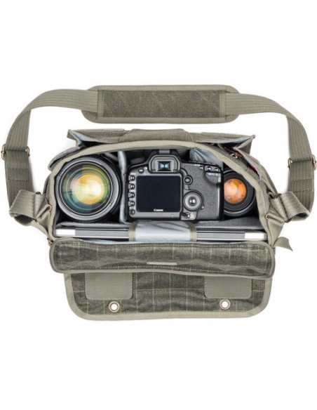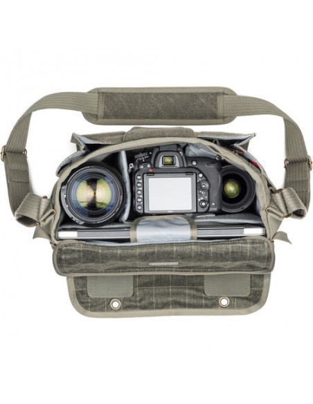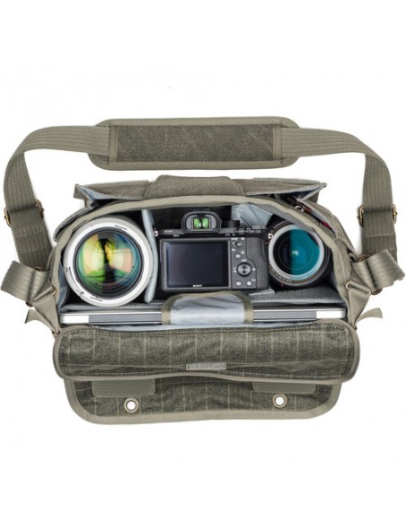 Una borsa elegante e discreta per il fotografo in movimento, questa borsa a tracolla nera Retrospective 7 V2.0 di Think Tank può contenere una combinazione di corpi macchina, obiettivi, laptop, tablet e altri accessori. La Retrospective 7 V2.0 può contenere una DSLR standard, due obiettivi, un flash e un tablet da 10" o un laptop da 13". Ha un'apertura con cerniera sullo scomparto principale che può essere riposta quando non è in uso e una patta anteriore con gancio e passante consente un rapido accesso. Una patta passante per maniglia bagaglio dedicata sul retro della borsa la rende facile da trasportare durante il viaggio. Lo scomparto anteriore può contenere diversi accessori e include una tasca con cerniera per oggetti di valore. È inclusa anche una copertura antipioggia con cuciture sigillate che racchiude completamente la borsa in caso di maltempo.