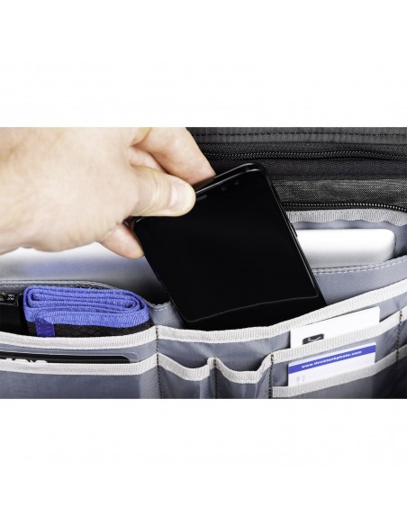- La tasca sicura con cerniera contiene batterie, portafogli per carte e altri accessori