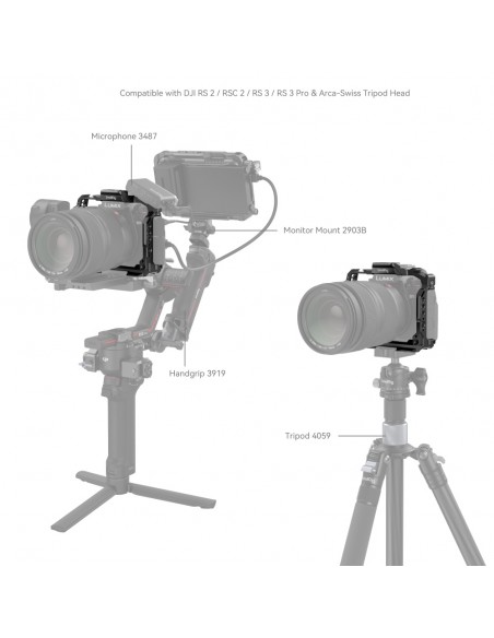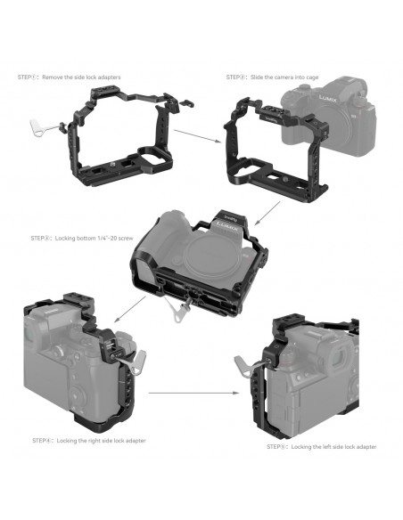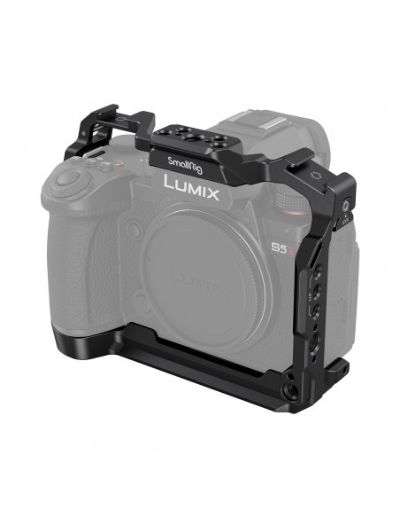 Gabbia SmallRig per Panasonic LUMIX G9 II / S5 II / S5 IIX 4022 è progettato per collegare accessori e proteggere la fotocamera. Blocca la fotocamera tramite una vite inferiore da 1/4"-20 e due adattatori di bloccaggio laterali, con cuscinetti in gomma che prevengono i graffi. Tra i punti di montaggio accessori, supporto per fori da 1/4"-20 e fori di posizionamento ARRI da 3/8"-16 Impugnatura superiore 2165C, impugnatura laterale 2093, ecc. per un facile spostamento della fotocamera e maggiore stabilità; il foro di posizionamento anteriore da 1/4"-20 si adatta al morsetto per asta 3276 per il sistema di messa a fuoco successiva; e il foro di posizionamento superiore ARRI da 3/8"-16 si adatta al supporto per monitor 2903B. Viene inoltre fornito con due supporti per slitta fredda per collegare microfono, luce video a LED; una guida NATO superiore per la maniglia superiore 3322; una guida NATO sinistra per la maniglia laterale 3847 ; e una presa QD inferiore per installare la tracolla QD. Nella parte inferiore è presente una piastra a sgancio rapido Arca-Swiss, adatta anche per gimbal DJI RS 2 / RSC 2 / RS 3 / RS 3 Pro e treppiedi Arca-Swiss come foro filettato per la piastra a sgancio rapido del gimbal DJI RS 2 / RSC 2 (pad di aumento dell'altezza) e la piastra a sgancio rapido Arca-Swiss 3154. L'articolo presenta anche fori per la cinghia su entrambi i lati e sul fondo, compatibili con la cinghia da polso PAC2456 , tracolla PSC2428, ecc. Inoltre, è inclusa una chiave magnetica per un facile smontaggio e montaggio.