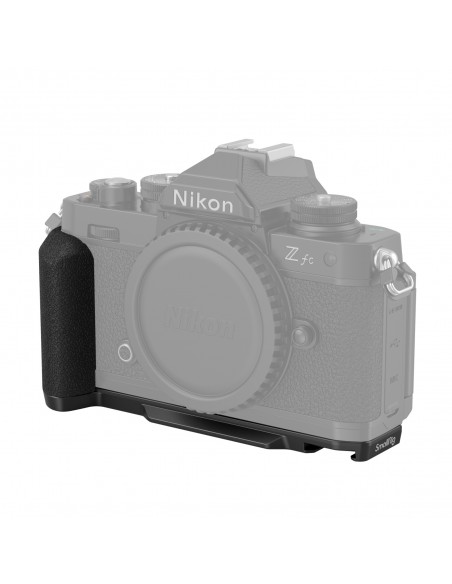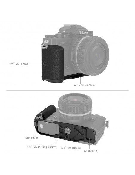 SmallRig L-Shape Grip per fotocamera Nikon Z fc è progettato per fornire una presa confortevole. L'impugnatura in stile retrò condivide una trama e un colore simili alla fotocamera; la piastra di base condivide lo stesso trattamento superficiale del colore con la fotocamera e si adatta perfettamente. L'impugnatura a L si fissa alla fotocamera tramite una vite ad anello a D da 1/4"-20 sul fondo e viene fornita con un foro filettato da 1/4"-20 incorporato sull'impugnatura che consente la ripresa verticale su un treppiede. La piastra di base presenta una piastra Arca Swiss integrata per passare rapidamente al tiro a treppiede e un foro filettato 1/4"-20 al centro che supporta un treppiede o una piastra di sgancio rapido Manfrotto. Inoltre, la piastra di base presenta una scarpa fredda integrata che consente di collegare microfono, luce e altri accessori; la piastra viene fornita anche con una fessura per il cinturino da polso. L'impugnatura adotta un design compatto e leggero, facile da trasportare.