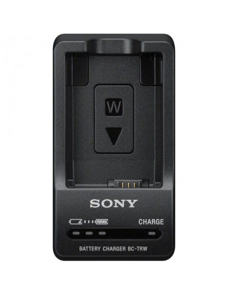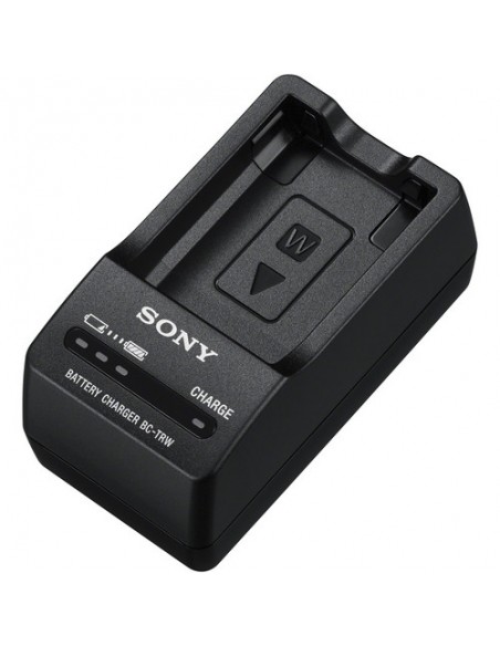 Il caricabatterie nero BC-TRW W Series di Sony è compatibile con la batteria InfoLITHIUM NP-FW50 che alimenta alcune fotocamere digitali. È dotato di un cavo di alimentazione. Il caricabatterie funziona con alimentazione 100-240 V CA per consentirne l'uso in tutto il mondo. Il BC-TRW ha anche una spia luminosa che mostra lo stato di carica.