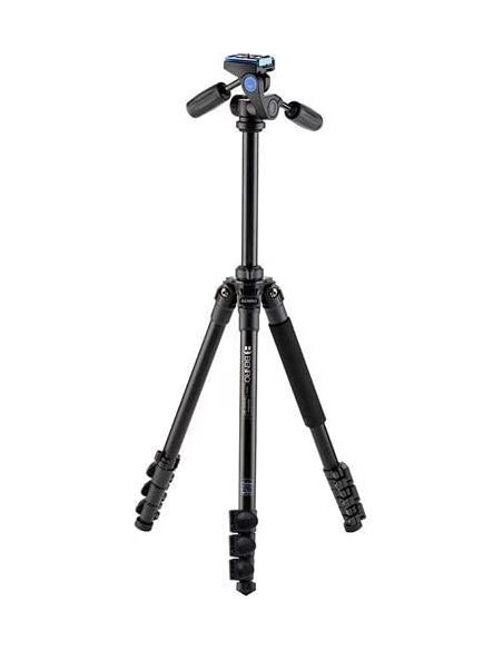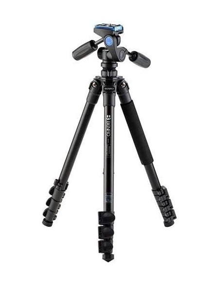 BENRO ADVENTURE KIT treppiedi classici con testa a sfera/leve, gambe a 4 sezioni regolabili su diversi angoli, crociera centrale, blocco/sblocco gambe a "flip" in magnesio, piedini in gomma intercambiabili.