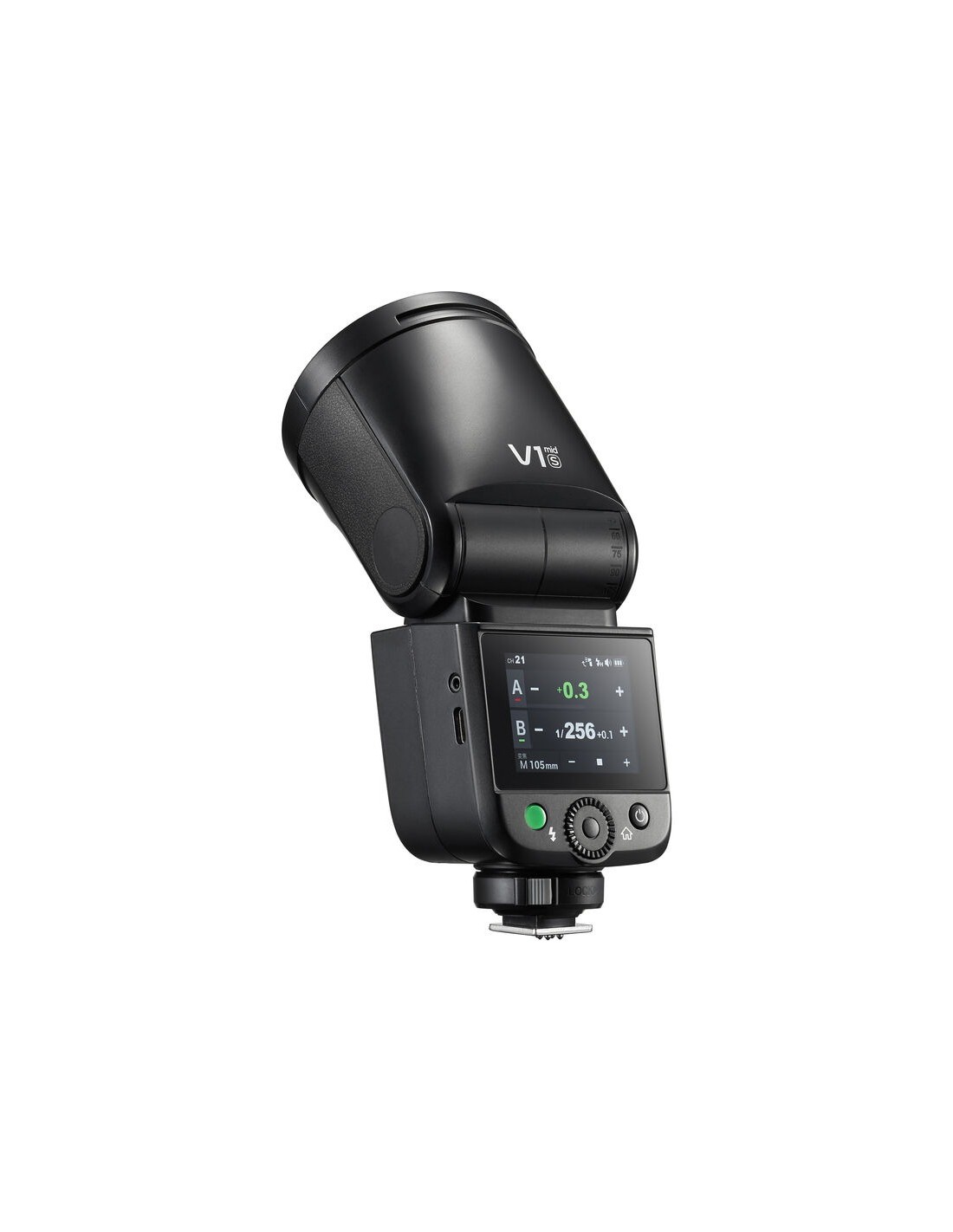 Alimentato da una batteria ricaricabile al litio da 7,2 V e 2200 mAh inclusa e con un tempo di ricarica di 1,7 secondi, il V1 mid consente 650 flash a piena potenza e una durata del flash compresa tra 1/600 e 1/20.000 di secondo. Un altro punto di forza è la lampada pilota LED da 2 W integrata con temperatura di colore 5300 K (+/-200 K) e luminosità regolabile (1-10). Gli indicatori di batteria sul pannello del display informano sul livello di carica rimanente. Godox include nella confezione il cavo di ricarica USB-C e l'adattatore.