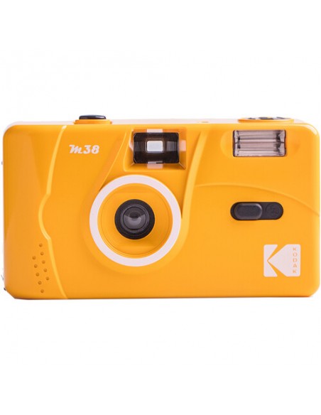 La M38 35mm di Kodak è una piccola macchina fotografica riutilizzabile con flash incorporato. Questa macchina fotografica ha un obiettivo a fuoco fisso, avvolgimento e riavvolgimento manuale della pellicola e un interruttore on/off per il flash. Funziona comodamente con una batteria alcalina AAA e accetta pellicole da 24x36mm.