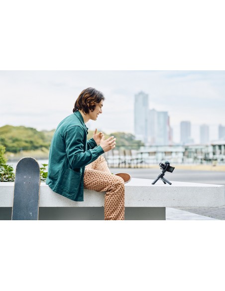 Usa ZV-1 II con l'impugnatura GP-VP2BT per un'esperienza di vlogging più stabile, intuitiva e divertente. Funziona senza cavo e batteria. Puoi usarla come mini cavalletto per ZV-1 II e premere il tasto di registrazione direttamente dall'impugnatura.
