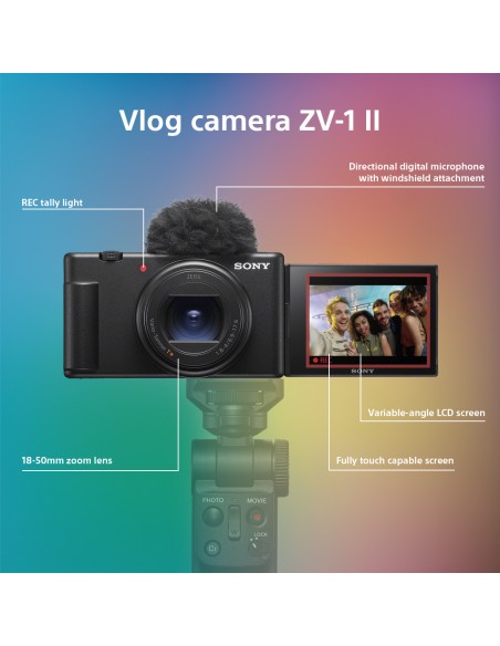 ZV-1 II è la vlog camera perfetta per creare le tue storie e condividere il tuo mondo. Dotata di un obiettivo con zoom integrato da 18-50 mm che consente di catturare il mondo circostante e di mettere a fuoco da vicino i soggetti, ZV-1 II offre un'ottima qualità video 4K grazie all'ampio sensore da 1".