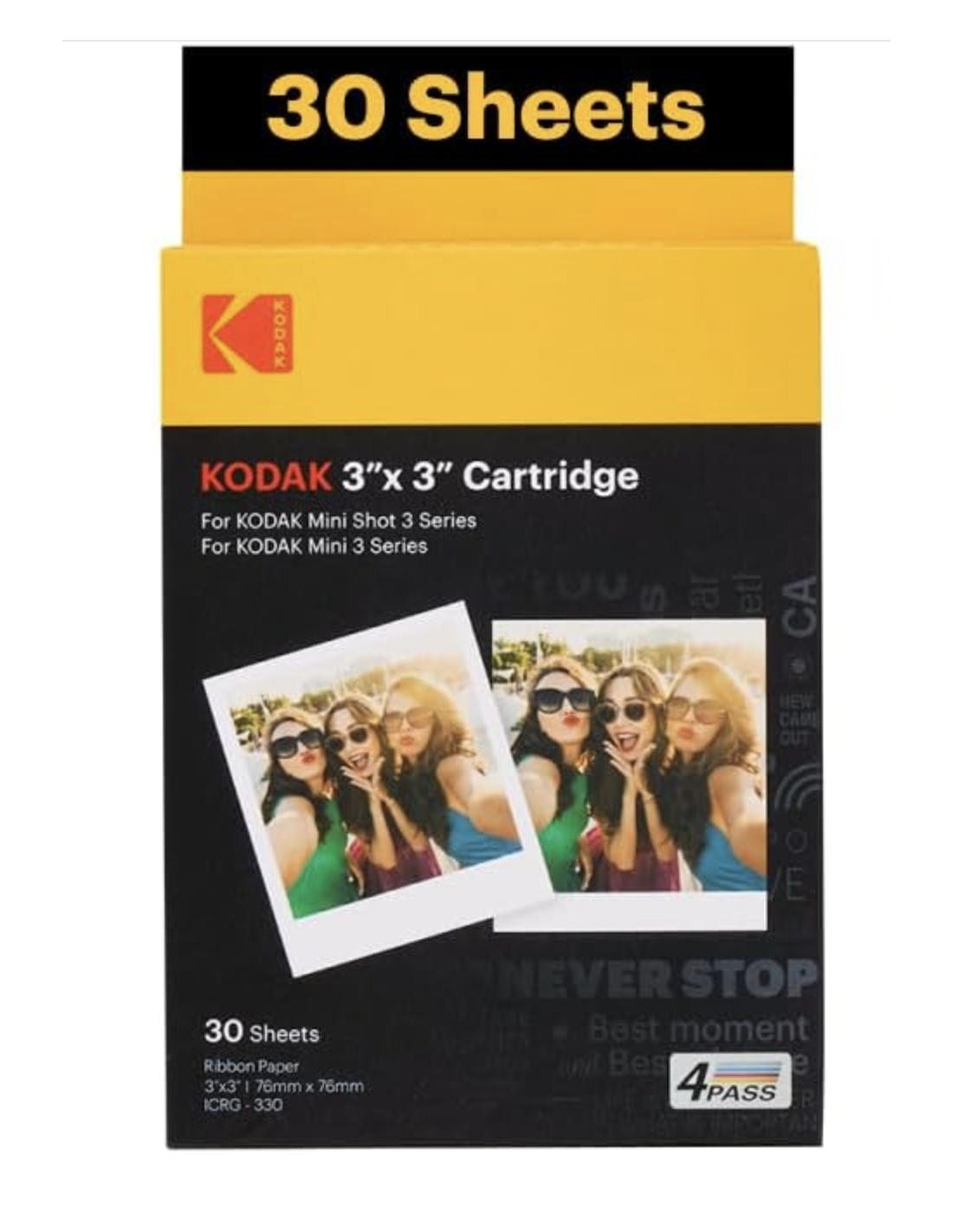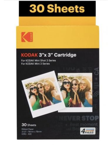 La cartuccia KODAK 4PASS All-in-One ICRG-360 è compatibile con KODAK Mini 3 e Mini Shot 3. Ogni set include 2 confezioni da 3 cartucce ciascuna, sufficienti per stampare 60 foto in totale.