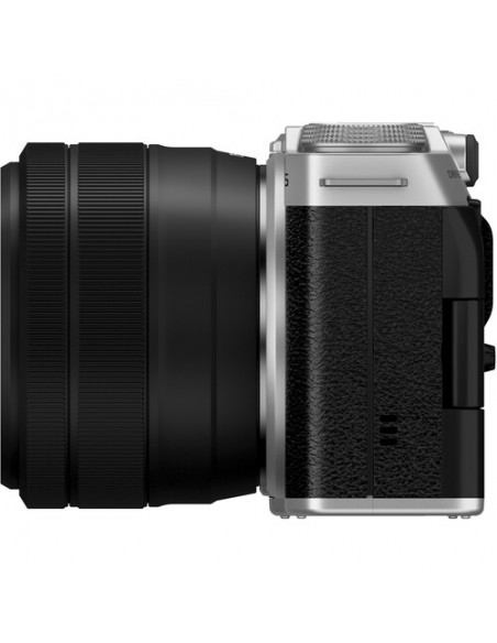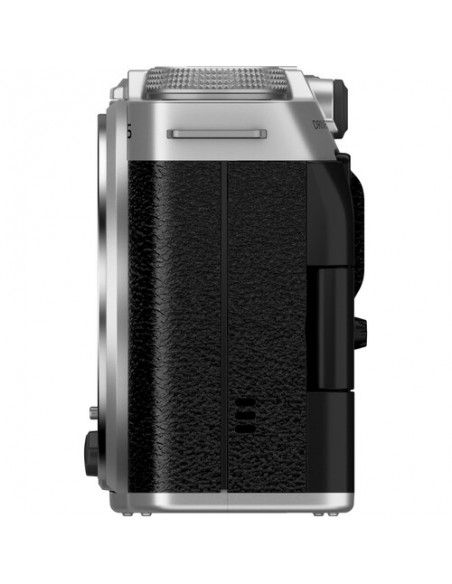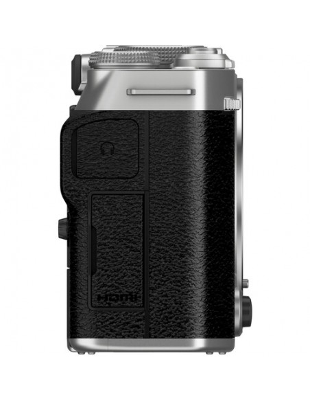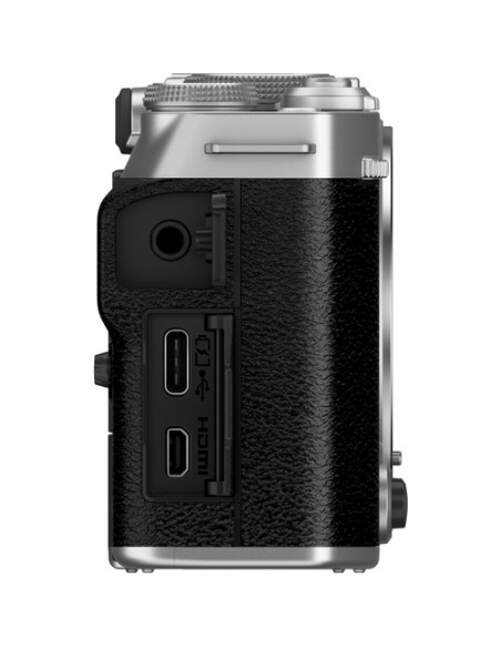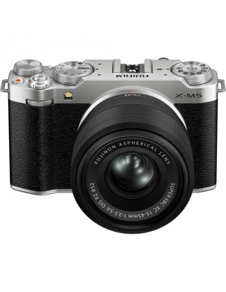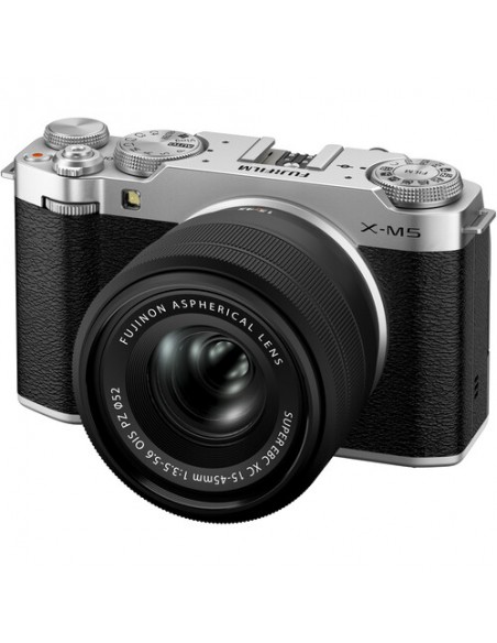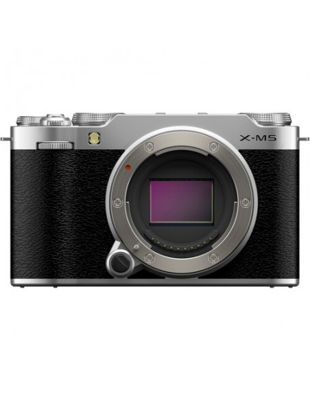 La X-M5 è il corpo più piccolo e leggero della serie X, con un peso di 12,5 once senza obiettivo e una larghezza di 4,4". In linea con l'estetica FUJIFILM e la filosofia di design della serie X, il corpo in stile telemetro argentato è dotato di una serie di quadranti superiori per impostare la modalità, la simulazione della pellicola e regolare le impostazioni. L'attacco dell'obiettivo intercambiabile accetta uno qualsiasi degli oltre 35 obiettivi della serie X, con la possibilità di collegare altri obiettivi con un adattatore opzionale appropriato.