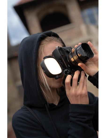 Se sviti la base magnetica, sotto troverai un supporto standard per slitta a contatto caldo che ti consente di far scorrere l'MVL-77 su fotocamere e videocamere con contatto a caldo. Quindi l'area in cui si punta l'obiettivo sarà sempre illuminata. In alternativa, tieni semplicemente la luce a LED in una mano mentre scatti foto con l'altra mano. Funziona meglio per illuminare ritratti o primi piani e scatti macro.