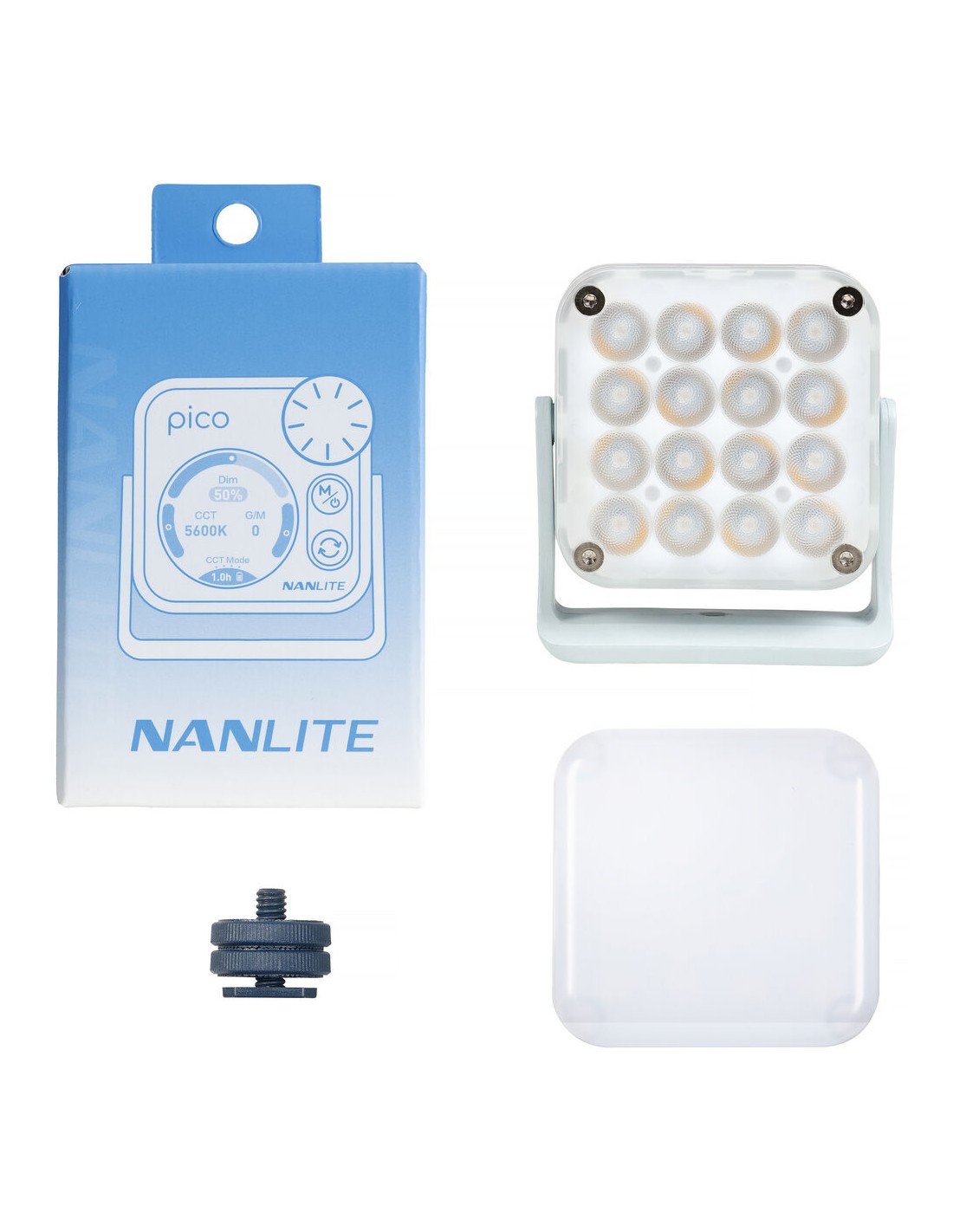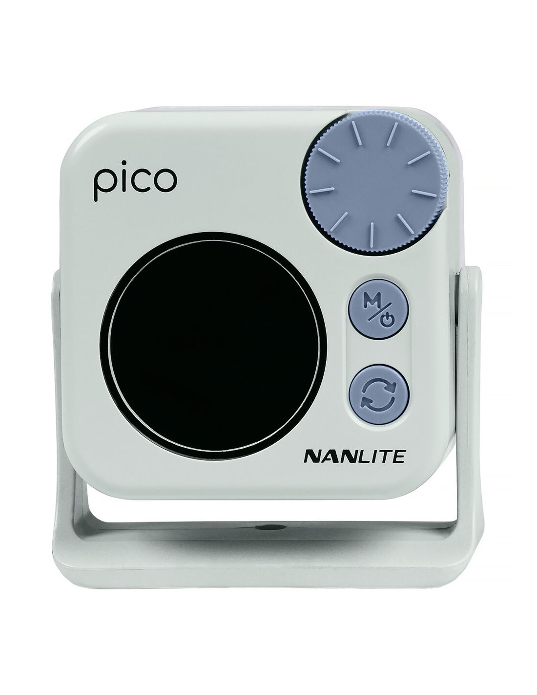 La Pico LED Mini Pocket Light di Nanlite è una luce LED compatta, a colori completi, con uno schermo rotondo integrato da 1,3" per una visualizzazione intuitiva dello stato e una batteria al litio da 1500mAh integrata, che fornisce circa 80 minuti di autonomia alla massima luminosità. Una porta USB-C integrata consente la ricarica e può fornire alimentazione continua se collegata a un power bank (disponibile separatamente). Il supporto a forcella è progettato con un attacco universale filettato da 1/4"-20 per un fissaggio rapido e semplice a treppiedi, stativi o teste a sfera, ma può anche essere attaccato a superfici magnetiche grazie ai magneti integrati sul fondo. Questa luce versatile offre un’ampia gamma di movimenti e viene fornita con un diffusore magnetico e un adattatore cold shoe.