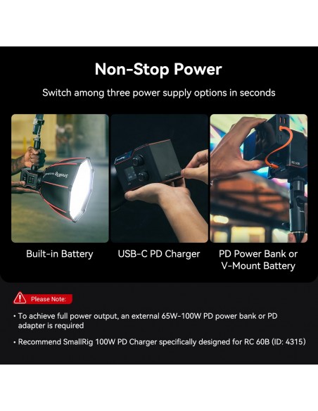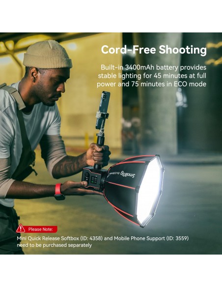 ·Batteria integrata da 3400 mAh: non è necessario collegare la piastra di montaggio della batteria, NP-F, batteria con attacco a V o cavi vari, la luce video COB da 60 W può essere utilizzata immediatamente, eliminando complicate fasi di assemblaggio. La durata massima della batteria è di 45 minuti a piena potenza e 75 minuti in modalità ECO.
