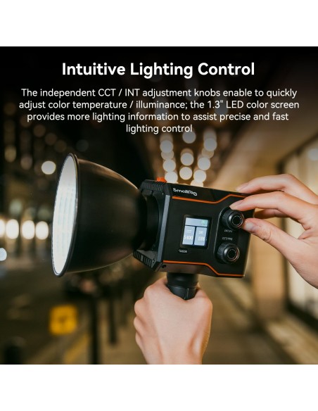 ·Controllo della luce semplice e preciso: sul lato del corpo della luce è presente una manopola di regolazione CCT/INT indipendente, che può regolare rapidamente la temperatura del colore e l'illuminazione, con un funzionamento semplice e un feedback tempestivo. Lo schermo a colori LED da 1,3" fornisce informazioni sull'illuminazione più ricche, consentendo di controllare con precisione i parametri di illuminazione e trovare la luce più adatta alla scena di ripresa.