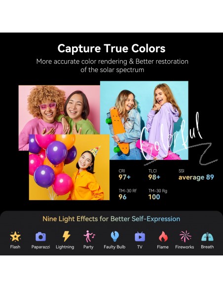 ·Indice di resa cromatica ultra elevato e 9 effetti di luce: CRI 97+, TLCI 98+ , media SSI 89, TM-30 Rf/Rg può raggiungere rispettivamente 96/100, che può veramente ripristinare il colore degli oggetti. Intervallo di temperatura colore 2700 K-6500 K. Sotto 1 m/5600 K, l'illuminazione della luce nuda è 2670 lux, e la l'illuminazione con la copertura standard è di 11.200 lux. 9 effetti di luce integrati, tra cui paparazzi, fuochi d'artificio, fulmini, lampadina rotta, TV, feste, fiamme, respiro e sfarfallio.
