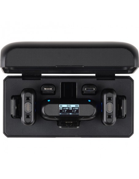 Il sistema include tutto il necessario per registrare discorsi nitidi e chiari in qualsiasi luogo con un raggio operativo wireless fino a 492 piedi. Ottieni due trasmettitori a clip, ciascuno con un microfono integrato, un ricevitore a doppio canale che si collega al supporto per scarpa della fotocamera o si collega direttamente al dispositivo tramite gli adattatori USB-C e Lightning inclusi e tutti gli accessori necessari per assicurati che le tue produzioni siano pronte per la trasmissione.