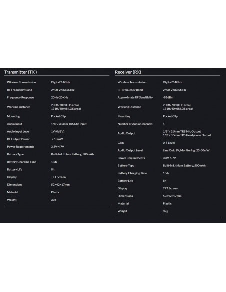 I display colorati sono presenti sia sul trasmettitore che sul ricevitore, per tenere l’utente aggiornato su tutti i parametri chiave del microfono.