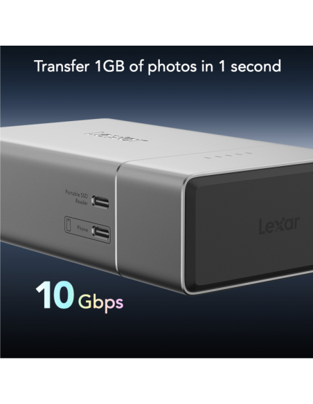 Compatibile con SSD e lettori portatili Lexar Professional Workflow, così puoi personalizzarli in base alle tue esigenze. La docking station portatile compatta a 2 alloggiamenti ti consente di eseguire il backup in movimento senza un laptop e di gestire l'unità dal tuo smartphone ed è più di 5 volte più leggera di un laptop.