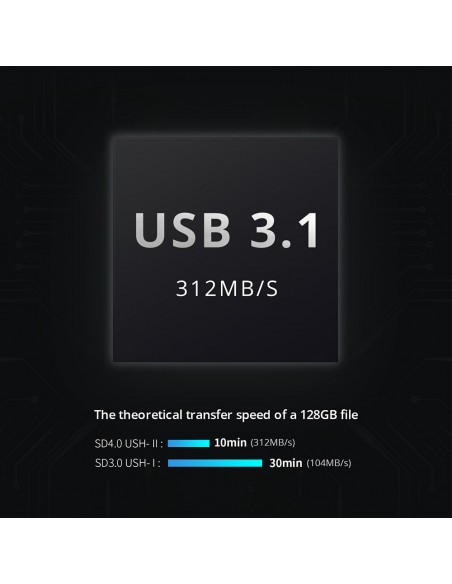 Questo lettore di schede offre una velocità di trasmissione fino a 312 MB/s utilizzando lo standard USB 3.2 Gen 1 (USB 3.1 Gen 1/USB 3.0) da 5 Gb/s. Supporta supporti UHS-II, UHS-I e non UHS SD e microSD.
