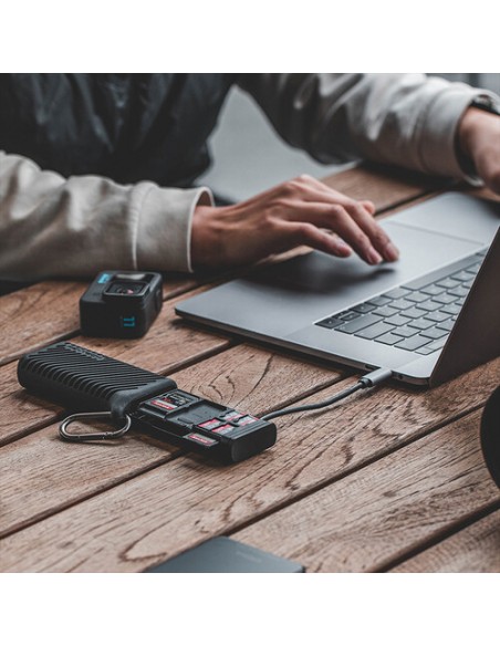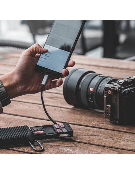 Trasporta le schede di memoria e trasferisci i dati utilizzando la custodia per lettore di schede ad alta velocità CreateMate di PGYTECH, che presenta uno slot per schede UHS-II SDXC e uno slot per schede microSDXC UHS-II, nonché spazio per riporre quattro schede SD, quattro schede microSD e quattro schede nano SIM. È classificato IP54, che aiuta a proteggere da cadute, sporco e schizzi, ed è compatibile plug-and-play con Windows, Mac, Linux e Android utilizzando un cavo USB-C 3.2 Gen 1 integrato da 5 Gb/s.