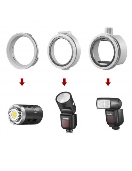 L`ML-CD15 è dotato di una serie di adattatori di montaggio che ne consentono l`utilizzo con Speedlite tradizionali, Speedlite a testa tonda o luci Flash e LED con attacco GODOX.