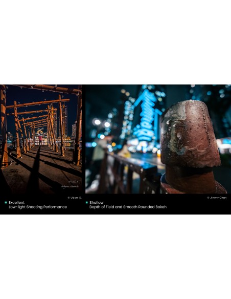 Apertura Luminosa L`ampia apertura di f/2 consente di scatate anche in situazioni di scarsa luminosità senza aumentare l`ISO. Allo stesso tempo, questo obiettivo è in grado di creare una migliore separazione dello sfondo tra il soggetto con una distanza di messa a fuoco più ravvicinata, e si può ottenere un bokeh morbido con un`eccellente profondità di campo.