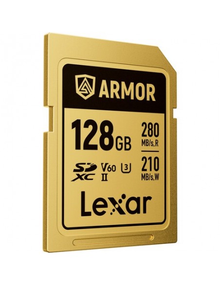La scheda di memoria SDXC ARMOR GOLD UHS-II da 128 GB di Lexar ha una capacità di archiviazione di 128 GB e sfrutta il bus UHS-II per supportare funzioni DSLR avanzate come raffiche di otturatore continuo e scatti rapidi, nonché acquisizioni raw e JPEG. Questa scheda è anche adatta per l'acquisizione video, inclusi video 6K, 4K e Full HD. Può raggiungere velocità di lettura massime fino a 280 MB/s e velocità di scrittura massime fino a 210 MB/s. Grazie alla sua classe di velocità V60, le velocità di scrittura minime sono garantite per non scendere sotto i 60 MB/s.