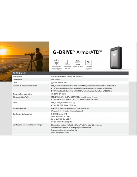 più importanti a un hard disk portatile instancabile come te. L’unità ad alta capacitàG-DRIVETM ArmorATDTMgarantisce una resistenza straordinaria per operare in qualsiasi condizione grazie all’involucro in alluminio anodizzato, al paracolpi protettivo in gomma e all’indice di protezione IP54 che lo rende impermeabile a pioggia e polvere.