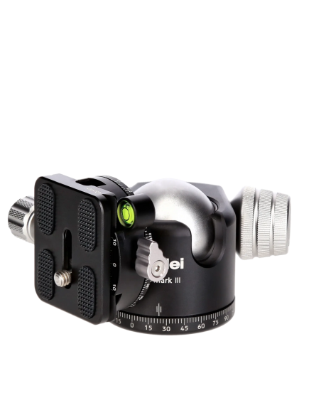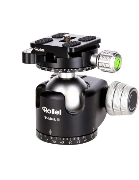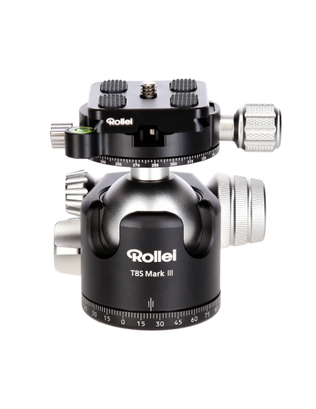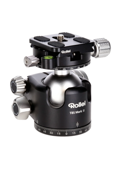 Il membro più versatile della nuova generazione di teste a sfera professionali di Rollei è senza dubbio la testa panoramica T8S Mark III . Fresate con cura in alluminio di qualità, le singole parti della testa lavorano insieme senza alcun gioco e la testa da sola consente un carico utile massimo di 22 kg . Questa capacità di carico è sufficiente persino per le fotocamere full-frame dotate di superteleobiettivi di classe premium. Il fissaggio dell'elemento sferico mantiene il carico massimo anche nei due fori a 90°, rapidamente intercambiabili, puntati in modo assolutamente sicuro sul soggetto desiderato. La vostra garanzia di qualità per esposizioni a lungo termine e scatti con filtro nitidissimi. La piastra a sgancio rapido Arca Swiss inclusa ha una lunghezza di 50 mm e offre una superficie di contatto sufficiente per valigie professionali particolarmente pesanti e altri accessori di fascia alta.Secondo asse panoramico per panorami perfetti