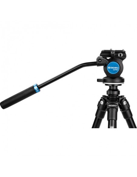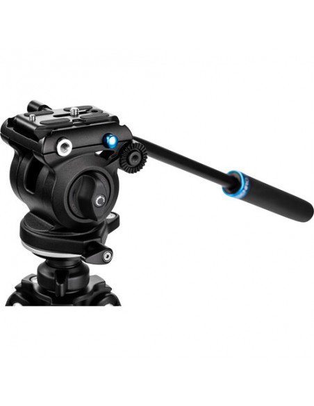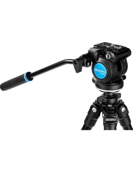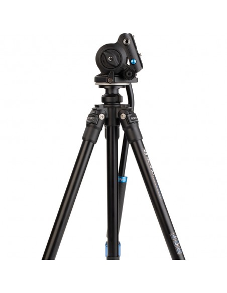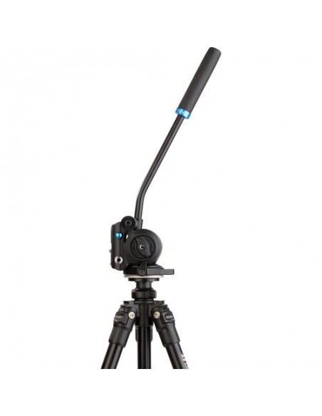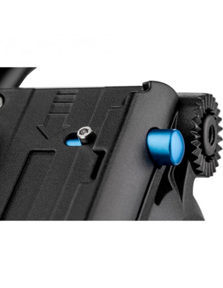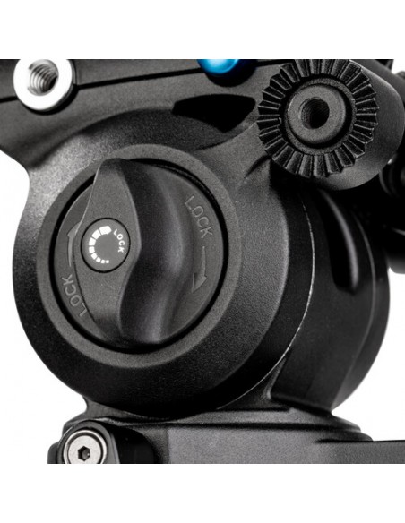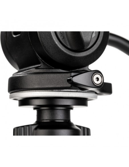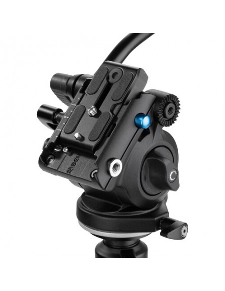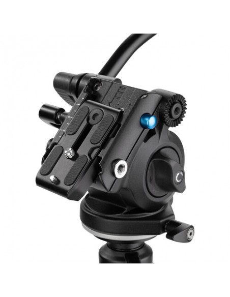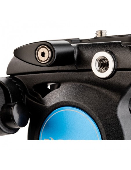 Testa dotata di movimento oleopneumatico sul movimento verticale: una frizione infatti consente di regolare la resistenza del movimento in funzione del peso della videocamera montata. La testa è dotata di impanatura da 3/8" che consente il montaggio di tutti i treppiedi dotati di vite standard.