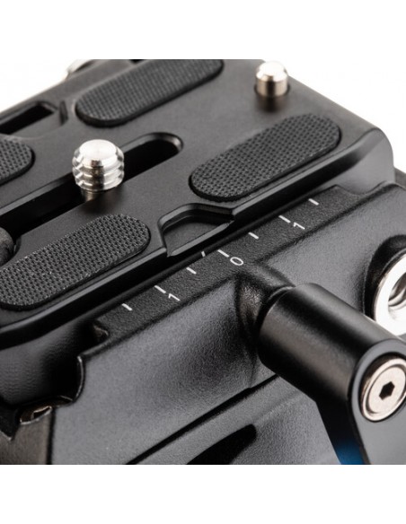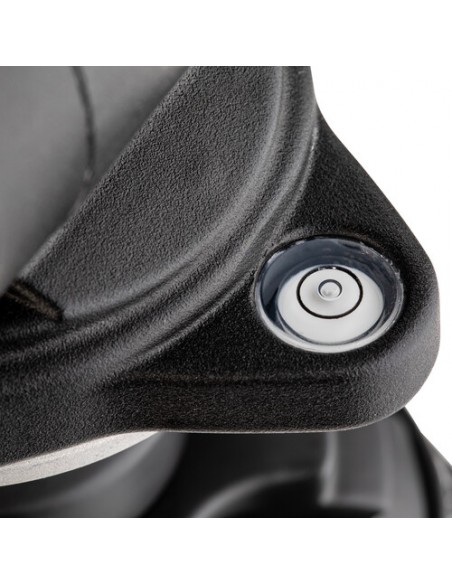 Piastra intercambiabile. Viti di blocco sui movimenti orizzontale e verticale. Slitta con blocco di sicurezza. Manopola reversibile (può essere montata a destra ed a sinistra della testa). Livella a bolla incorporata.