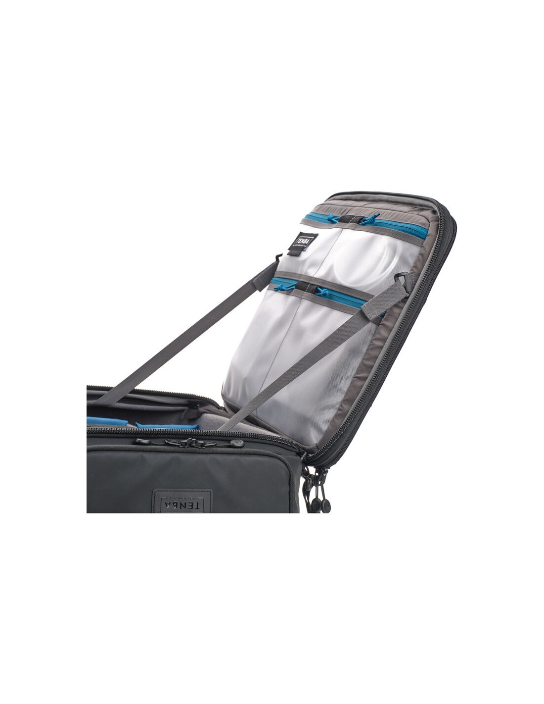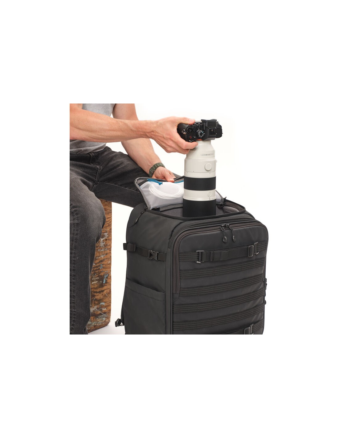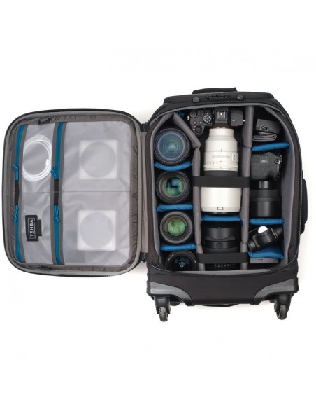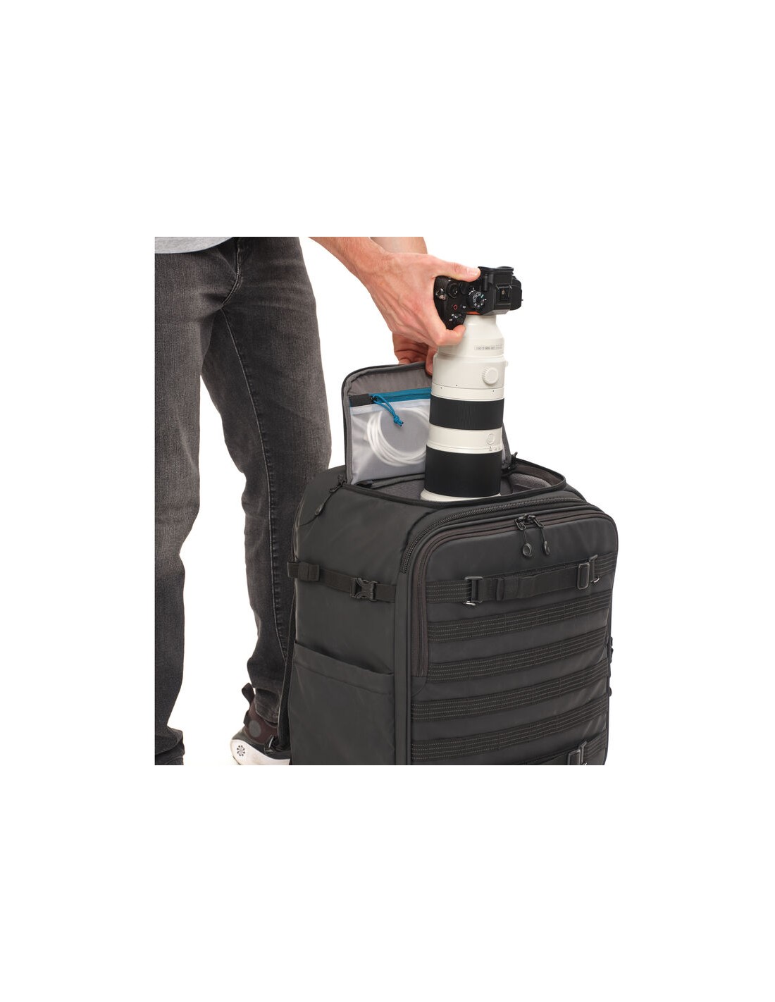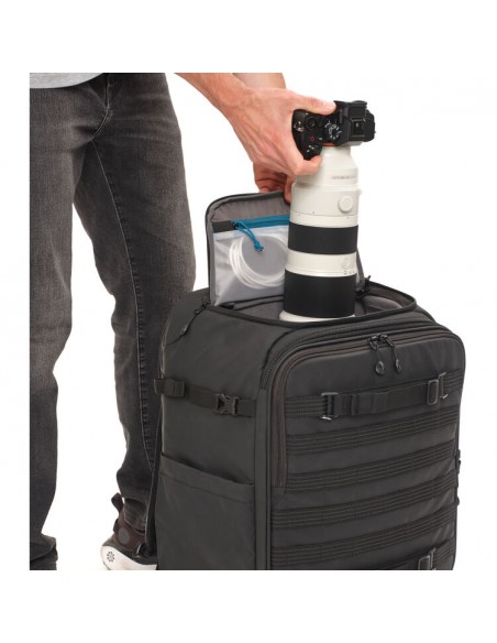 Lo zaino con ruote Axis V2 di Tenba è una borsa versatile che offre sia un trasporto agevole e comodo su ruote per le strade e gli aeroporti, sia la praticità di un trasporto a zaino rapido e confortevole quando necessario. La capienza di 28 litri è dotata di divisori interni imbottiti per due fotocamere DSLR o mirrorless e fino a sette obiettivi. Realizzato con un telaio leggero in alluminio, offre la resistenza di un bagaglio con la praticità di uno zaino. Può ospitare obiettivi lunghi fino a 200-600 mm o 400 mm f/2.8, accessibili rapidamente tramite l'apertura superiore. La tasca laterale esterna rinforzata permette di riporre un gimbal, un treppiede o una borraccia. Il pannello MOLLE consente di fissare l'attrezzatura all'esterno dello zaino per un accesso rapido e semplice durante le riprese. L'Axis V2 è conforme alla maggior parte delle normative sul bagaglio a mano delle compagnie aeree, ma è consigliabile verificare con la propria compagnia prima della partenza.