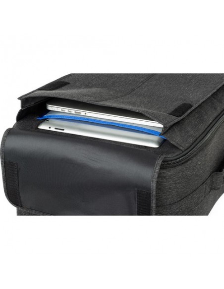 Una tasca esterna elastica con chiusura con patta touch-tab può ospitare un tablet da 10" e un laptop da 17" all'interno di una custodia protettiva