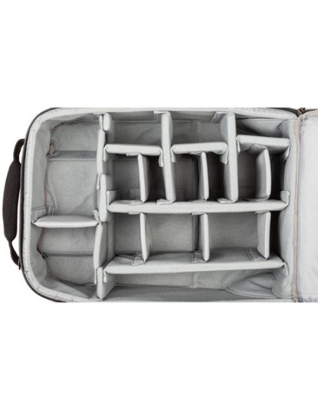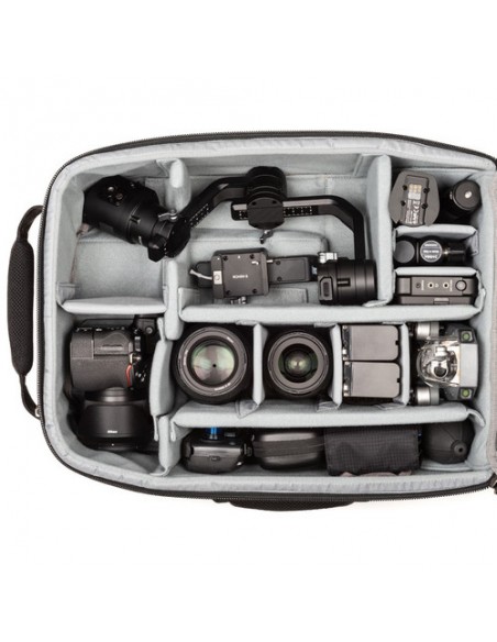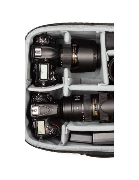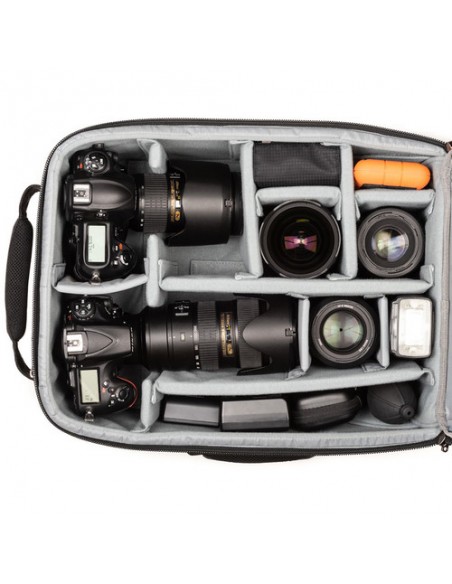 Lo scomparto principale può contenere da otto a dieci obiettivi, flash, accessori e fino a due corpi macchina DSLR; o un sistema di fotocamere mirrorless equivalente