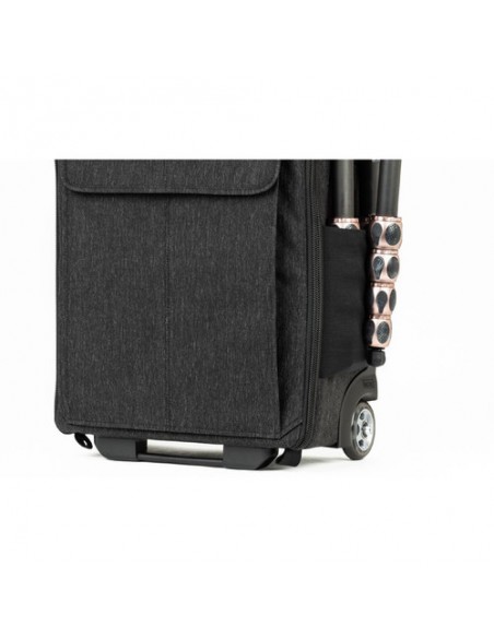 All'esterno della custodia mobile è presente una tasca estensibile suddivisa per un tablet da 10" e un laptop da 17" all'interno di una custodia protettiva. Una grande patta con chiusura touch-tab copre la tasca estensibile, mentre una tasca per treppiede e cinghie per accessori consentono di fissare comodamente i supporti della fotocamera lateralmente.