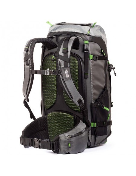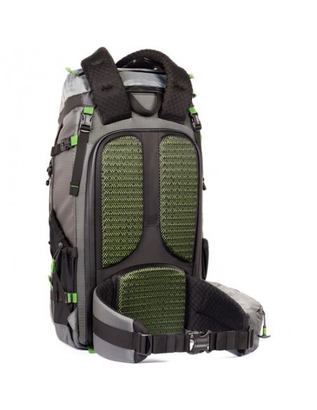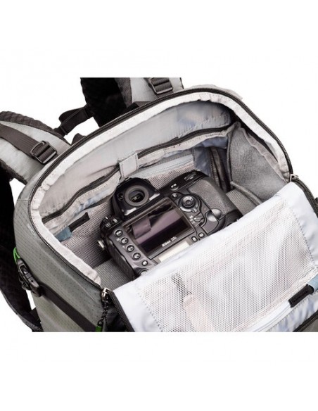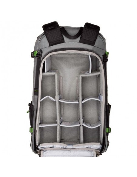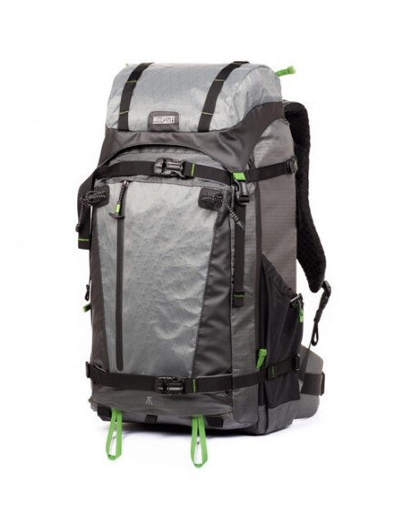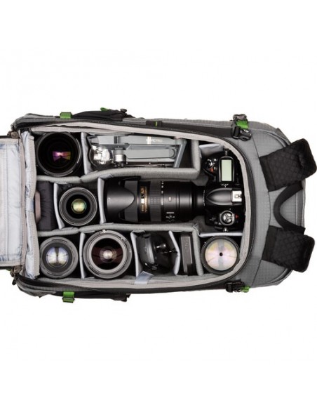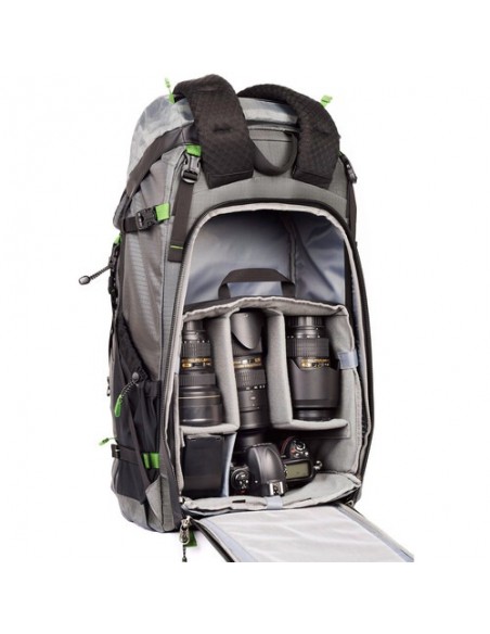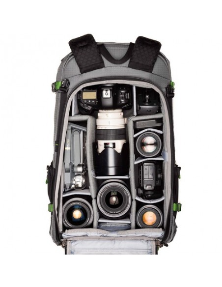 uesto zaino grigio BackLight Elite 45L di MindShift Gear è progettato per soddisfare gli interessi combinati del fotografo d'avventura e dell'appassionato di sport invernali. Lungo la parte anteriore e laterale di questo zaino, più cinghie di compressione e passanti per attrezzatura consentono di agganciare e trasportare comodamente sci, snowboard, ciaspole o altre attrezzature da montagna all'aperto come piccozze o bastoncini da trekking. All'interno, l'ampio scomparto principale ospita una custodia per attrezzatura fotografica inclusa. La custodia per attrezzatura e i suoi dieci divisori imbottiti con linguetta touch possono contenere un kit per due fotocamere DSLR con tre obiettivi principali insieme a un obiettivo zoom da 16-35 mm, un obiettivo zoom da 24-70 mm e uno zoom da 70-200 mm. In alternativa, la custodia per attrezzatura può essere configurata per un kit multimediale con due fotocamere mirrorless, tre obiettivi zoom, un obiettivo principale e un piccolo drone. Per gli utenti di ottiche ultra-teleobiettivo, anche quando la custodia per l'attrezzatura è dedicata a un obiettivo da 600 mm e una DSLR, rimane una capacità aggiuntiva per una seconda fotocamera, un obiettivo zoom da 70-200 mm o altri accessori.