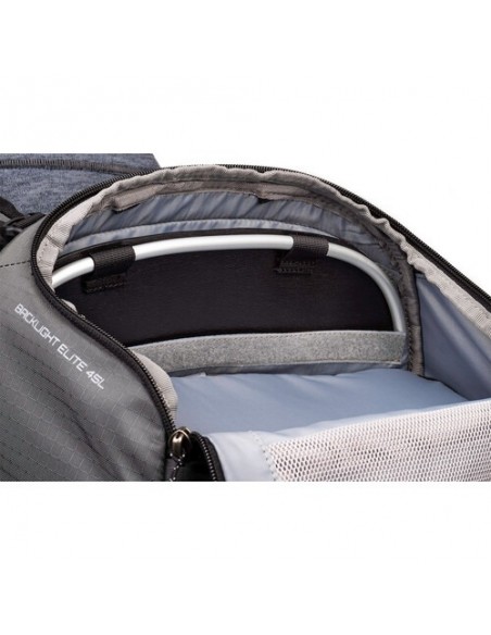 Per gite secondarie o destinazioni che non richiedono la piena capacità del BackLight Elite 45L, il suo coperchio superiore e la cintura in vita possono essere rimossi e combinati per formare uno zaino compatto che poggia comodamente sui fianchi e sulla parte bassa della schiena di chi lo indossa. Una volta completamente assemblato, il BackLight Elite 45L può essere sollevato tramite la maniglia di trasporto integrata e trasportato tramite gli spallacci imbottiti e regolabili. La cintura in vita dello zaino serve quindi a trasferire il peso dalle spalle ai fianchi per un comfort aggiuntivo, mentre la cinghia sullo sterno limita ulteriormente gli spostamenti involontari intorno a chi lo indossa. Caratterizzato da una struttura in nylon resistente, il BackLight Elite 45L è costruito per resistere alle intemperie e include una copertura con cuciture sigillate per l'uso sotto forti piogge.