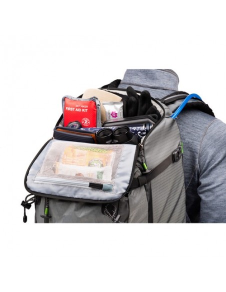 Durante lo stoccaggio o il trasporto, l'apertura superiore del BackLight Elite 45L può essere chiusa da un coperchio superiore incluso che si aggancia a quattro cinghie regolabili lungo i pannelli anteriore e posteriore dello zaino per una vestibilità sicura. Il coperchio superiore presenta una tasca con cerniera rivolta verso la schiena di chi lo indossa, che consente di raggiungere il suo contenuto senza dover rimuovere il BackLight Elite 45L. Allo stesso modo, le tasche con cerniera lungo entrambi i lati della cintura in vita dello zaino forniscono un deposito sicuro in movimento, mentre una tasca con cerniera lungo il pannello anteriore può contenere accessori fotografici destinati all'uso ogni volta che il BackLight Elite 45L viene appoggiato.