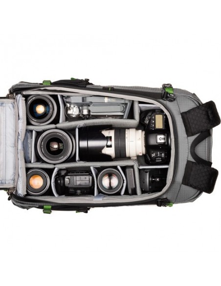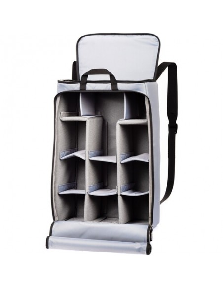 La custodia rimovibile per l'attrezzatura con dieci divisori imbottiti con linguetta touch può contenere e organizzare un kit per due fotocamere DSLR con tre obiettivi principali insieme a un obiettivo zoom da 16-35 mm, uno da 24-70 mm e uno da 70-200 mm.